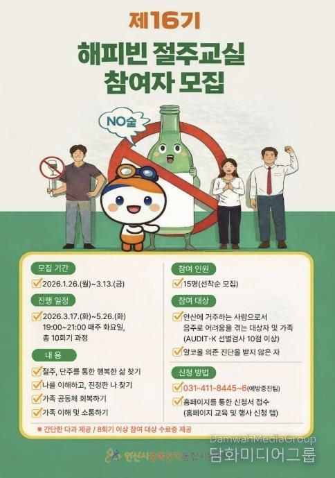 참여 대상은 관내 거주자 중 음주로 어려움을 겪고 있는 대상자(AUDIT-K 선별검사 10점 이상)와 가족이며, 알코올 의존 진단을 받지 않은 시민을 대상으로 한다. 안산시중독관리통합지원센터 누리집 또는 전화로 신청할 수 있고, 선착순으로 총 15명을 모집한다.