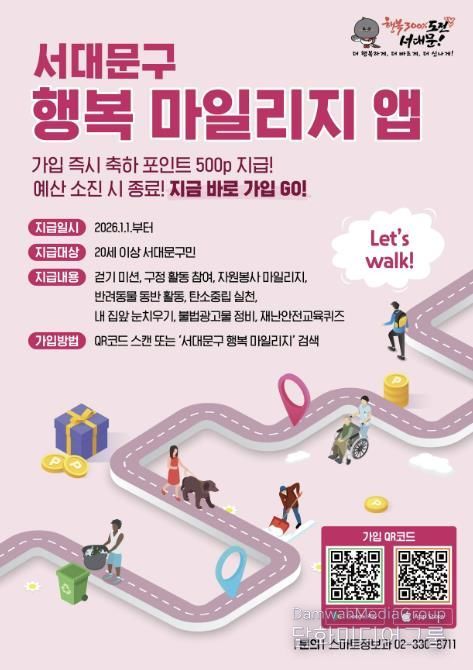 ‘서대문구 행복 마일리지’는 걷기, 자원봉사, 반려동물 동반 활동, 탄소중립 실천, 내 집 앞 눈 치우기 등 다양한 일상 활동을 포인트로 적립해 주는 ‘지자체 최초의 포인트 통합관리 플랫폼’이다. 포인트 지급은 20세 이상 서대문구민을 대상으로 이뤄진다.