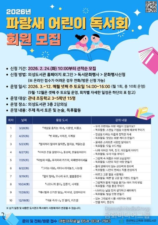 시민행정신문 기자 | 경상북도교육청 의성도서관은 오는 24일부터 ‘2026년 파랑새 어린이 독서회’ 신규 회원을 모집한다.