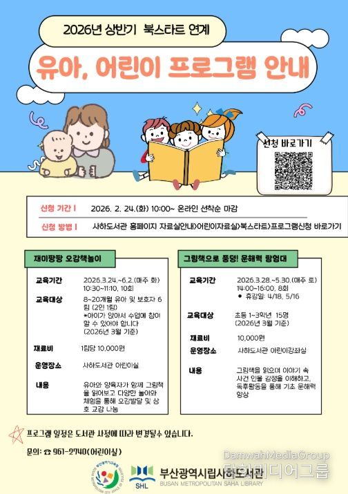 김정남 사하도서관장은 “이번 북스타트 연계 프로그램은 아이들의 언어 이해력과 독서 흥미를 키우는 계기가 될 것”이라며 “그림책을 매개로 자녀와 보호자가 정서적으로 교감하며 가정 내 독서문화가 확산하길 바란다”고 말했다.