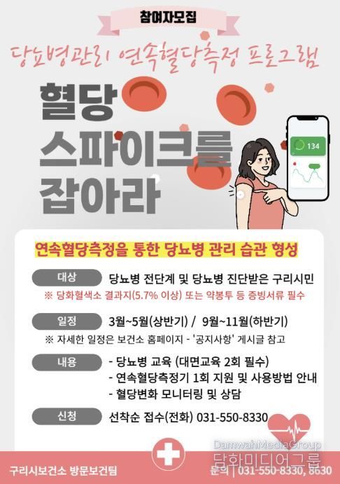 시민행정신문 기자 | 구리시 보건소는 2월 23일부터 당뇨병관리 연속혈당측정 프로그램 '혈당 스파이크를 잡아라'의 참여자를 모집한다고 밝혔다.
