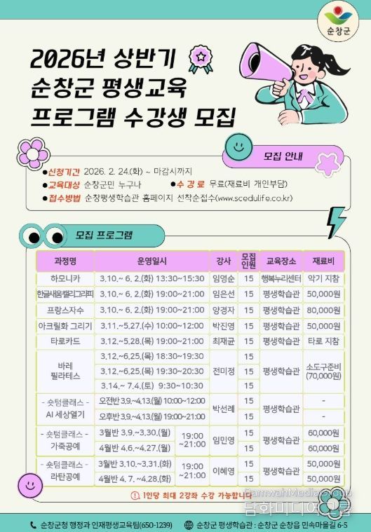 시민행정신문 강갑수 기자 | 순창군이 이달 24일부터 ‘2026년 상반기 평생교육 프로그램’ 수강생 모집을 시작한다.