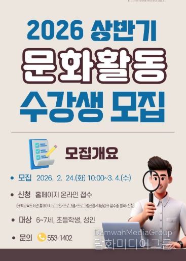 시민행정신문 기자 | 태백교육도서관은 3월 18일부터 7월 8일까지 지역 내 유아·초등학생·성인을 대상으로 ‘2026년 상반기 문화활동강좌’를 운영한다.