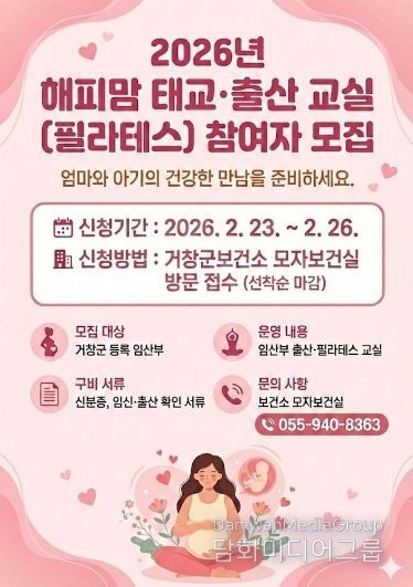 시민행정신문 기자 | 거창군은 건강한 임신기와 체계적인 산후 관리를 돕기 위해 지난 23일부터 26일까지 4일간 ‘해피맘 태교·출산 필라테스 교실’ 수강생 24명을 선착순으로 모집한다.