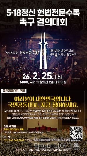 시민행정신문 강갑수 기자 | 광주광역시와 전국 시민사회단체, 5·18단체 등은 오는 25일 오후 2시 국회의원회관 대회의실에서 ‘5·18정신의 헌법전문 수록을 촉구하는 국민결의대회’를 개최한다.