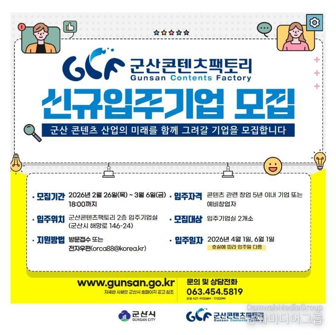 시민행정신문 강갑수 기자 | 군산시가 콘텐츠 산업 창업 활성화 및 지역 기업 육성을 위해 군산콘텐츠팩토리 신규 입주기업 2개사를 모집한다.