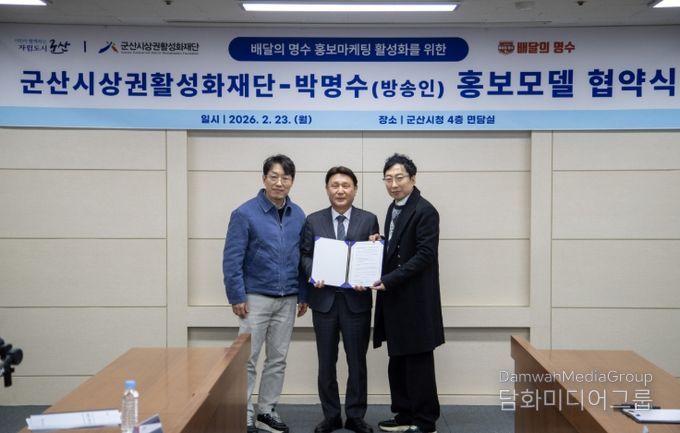 시민행정신문 강갑수 기자 | 군산시상권활성화재단은 2월 23일 시청 상황실에서 군산 출신 개그맨 박명수와 공공배달앱 ‘배달의 명수’ 홍보모델 업무협약을 체결했다.
