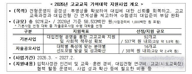 시민행정신문 김학영 기자 | 교육부은 2월 24일, ‘2026년 고교교육 기여대학 지원사업 기본계획’을 발표한다.