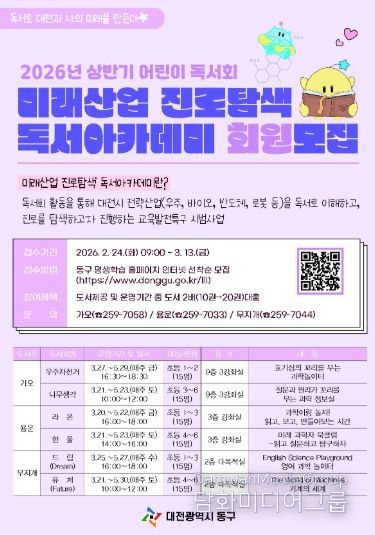 시민행정신문 기자 | 대전 동구는 지역 내 공공도서관인 가오·용운·무지개도서관에서 2026년 상반기 독서회 ‘미래산업 진로탐색 독서아카데미’를 운영하며, 이달 24일부터 참여 회원을 모집한다고 밝혔다.