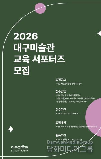 시민행정신문 강갑수 기자 | 대구문화예술진흥원 대구미술관은 2026년 한 해 동안 지역 문화예술발전과 미술관 교육 현장을 함께 만들어 갈 문화자원봉사자 ‘교육 서포터즈’를 모집한다.