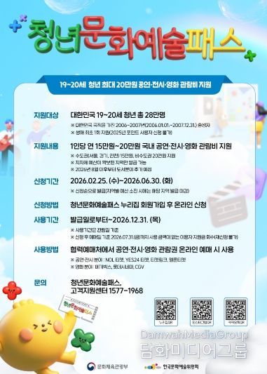 올해는 지원 대상을 기존 19세에서 20세까지 확대해 2006~2007년생 청년에게 1인당 연 20만 원 상당의 온라인 포인트를 지급한다. 다만 2006년생 가운데 2025년 청년문화예술패스 포인트를 이미 사용한 경우에는 지원 대상에서 제외된다.