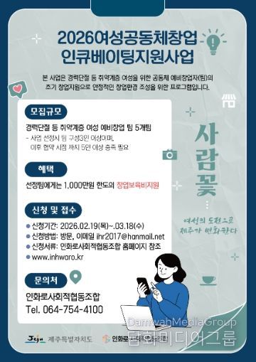 시민행정신문 기자 | 제주특별자치도가 인화로사회적협동조합과 함께 여성의 경제적 자립과 공동체 기반 창업 활성화를 위한 ‘제주 여성공동체 창업 인큐베이팅 지원사업’을 본격 추진 한다.
