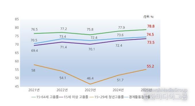군에 따르면, △OECD 기준 15~64세 고용률 78.8%(지난해 하반기 比 0.9↑) △15세 이상 전체 고용률 73.5%(지난해 하반기 比 1.1↑) △청년고용률 55.2%(지난해 하반기 比 3.5↑) △경제활동참가율 74.5%(지난해 하반기 比 0.9↑)로 각 분야에서 도내 1위를 기록했다.