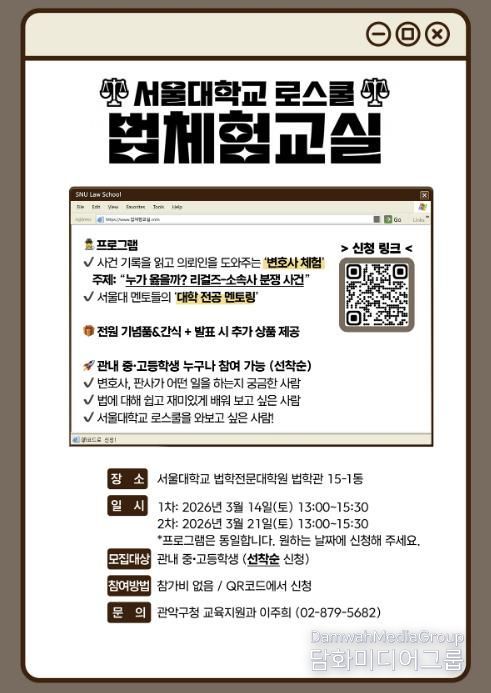 이번 법체험 교실은 3월 14일과 21일 두 차례 서울대학교 법학전문대학원에서 운영된다. 참여를 희망하는 관내 중‧고등학생은 오는 3월 3일부터 10일까지 홍보 포스터의 QR코드를 통해 개별 신청하면 된다.
