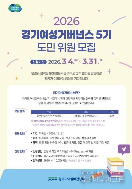 시민행정신문 강갑수 기자 | 경기도여성비전센터가 2026년 ‘경기여성거버넌스’에서 활동할 도민위원을 오는 3월 31일까지 모집한다.
