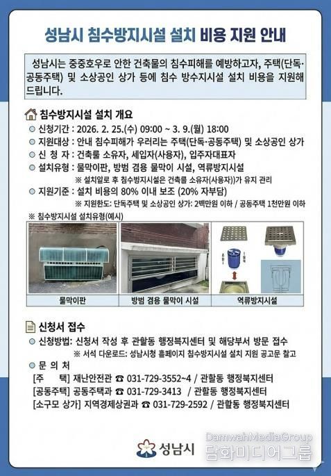 시민행정신문 강갑수 기자 | 성남시는 여름철 집중호우로 인한 주택과 상가의 침수 피해를 사전에 예방하기 위해 침수방지시설 설치 비용을 최대 80%까지 지원한다.