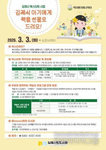 시민행정신문 강갑수 기자 | 김제시립도서관은 오는 3월 3일 화요일부터‘책과 함께 인생을 시작하자’는 취지로 영·유아 대상의 북스타트 책꾸러미 배부 사업을 진행한다고 말했다.