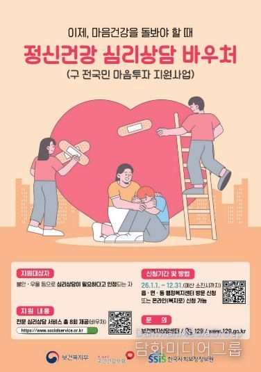 배강숙 건강위생과장은 “심리적으로 도움이 필요한 시민의 마음건강을 돌보고 정신질환을 예방하기 위해 정신건강 심리상담 바우처사업을 운영하고 있다”며 “이 사업을 통해 어려움을 겪는 시민들이 도움을 받을 수 있길 바란다”고 말했다.