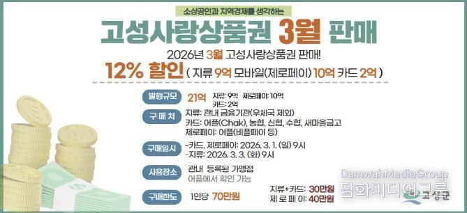 정부가 올해 지역사랑상품권 발행지원 사업에 대한 국비 지원을 확대함에 따라, 고성군은 이에 적극 대응해 군민 지원 강화를 결정했다. 오는 3월 발행분인 21억 원부터 고성사랑상품권(지류형·모바일·카드형) 전 유형에 12% 할인율이 적용된다.