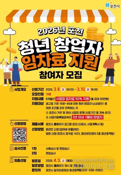 시민행정신문 강갑수 기자 | 포천시는 청년 창업자의 안정적인 창업 환경 조성과 창업 지속 가능성 제고를 위해 '2026년 청년 창업자 임차료 지원사업' 참여자를 2026년 3월 6일부터 10일까지 모집한다.