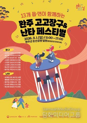 시민행정신문 강갑수 기자 | 완주문화재단은 오는 3월 1일 완주군 둔산공원 일원에서 13개 읍·면이 2026 완주 고고장구&난타 페스티벌을 개최한다.