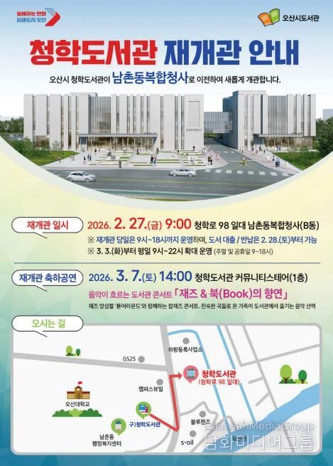 오는 3월 7일 오후 2시에는 청학도서관 1층 커뮤니티스테어에서 재개관을 기념한 공연 ‘재즈 & 북(Book)의 향연: JAZZ VIBE’가 열린다. 이번 공연은 소리울도서관 주관으로 진행되며, 참여 신청은 3월 3일 오전 10시부터 오산시 교육포털 ‘오늘e’를 통해 선착순 접수한다.