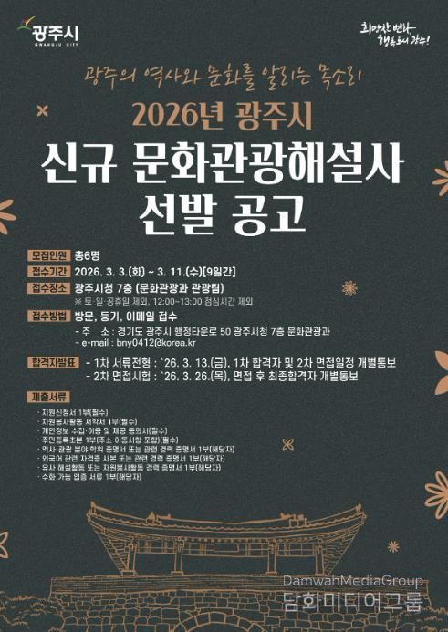 시민행정신문 강갑수 기자 | 광주시는 2026년도 광주시 문화관광 해설사 신규 선발을 위해 오는 3월 3일부터 11일까지 원서 접수를 실시한다고 25일 밝혔다.