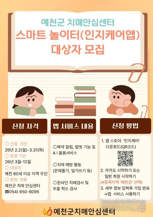 한편, 신규 가입자를 독려하기 위해 3월 한 달간 앱 내에서 ‘일기 쓰기’를 10회 이상 작성한 참여자에게는 편의점 5천 원 쿠폰을 증정하는 특별 챌린지를 진행할 예정이며, 사업과 관련한 자세한 문의는 예천군 치매안심센터로 하면 된다.