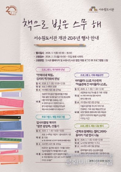 시민행정신문 기자 | 수원시 서수원도서관이 개관 20주년을 맞아 3월 7일 오전 10시 30분부터 기념행사 ‘책으로 빚은 스무 해’를 개최한다.