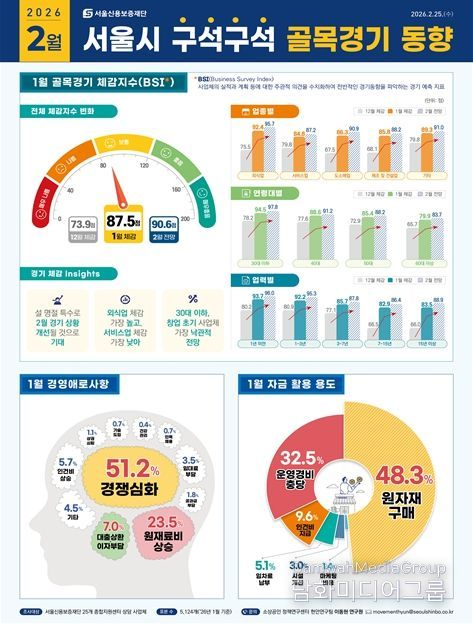 서울신용보증재단(이하 서울신보)은 서울시 소상공인, 자영업자들이 실제 체감하는 경영상황ㆍ애로사항 등을 빠르게 파악하고, 민생 현장에 맞는 지원책을 마련하기 위해 ’26년 2월부터 월 단위의 “골목경기 동향”을 발표한다.