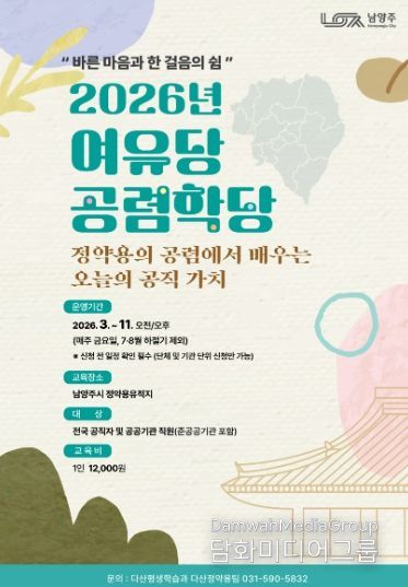 시민행정신문 기자 | 남양주시는 정약용유적지 일원에서 전국 공직자와 공공기관 직원을 대상으로 ‘2026년 상반기 여유당 공렴학당’ 교육생을 모집한다고 26일 밝혔다.