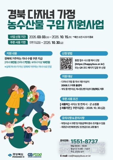 김광열 영덕군수는 “다자녀 가정에 실질적인 지원과 복지를 실현하는 것은 물론 지역농수산물의 소비 촉진으로 지역경제에 활력을 불어넣는 데도 도움이 될 것”이라며, “다자녀 가정을 위한 다양한 지원·복지 사업을 통해 출산과 양육에 친화적인 영덕으로 자리매김해 나가겠다”라고 전했다.