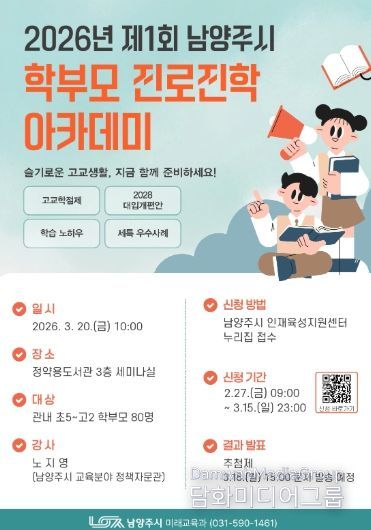 시민행정신문 기자 | 남양주시는 오는 27일부터 정약용도서관에서 열리는 ‘2026년 제1회 학부모 진로진학 아카데미’ 참가자를 모집한다고 밝혔다.