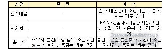 특히, 올해에는 청년층의 취업활동 보장과 출산ㆍ육아의 안정적 지원을 위해 ‘입사 예정’,‘배우자 난임치료’및‘본인 출산휴가’사유 연기기준을 신설했다. 이번 연기제도 개선으로 청년층의 일상과 병역이 조화를 이루는데 도움이 될 것으로 기대하고 있다.