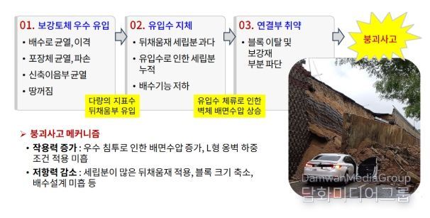 (붕괴 원인) 보강토옹벽 상부에 있는 배수로와 포장면의 균열을 통해 보강토옹벽으로 빗물이 지속적으로 유입되어 뒤채움재*가 약화됐고, 보강토옹벽 상단에 설치된 L형 옹벽이 침하되면서 포장면 땅꺼짐과 균열이 발생했다. 사고 직전 시간당 39.5mm의 집중호우에 의하여 균열과 땅꺼짐 부위로 빗물 유입이 증가했으며, 이 유입수가 제대로 배수되지 않아 보강토옹벽에 작용하는 압력(수압)이 가중되어 붕괴된 것으로 분석됐다.