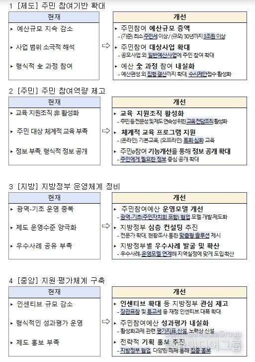 행정안전부는 주민참여예산제도가 현장에서 더욱 활성화되도록 주민, 전문가 등의 의견을 수렴해 다음과 같은 중점 추진 과제를 마련했다.