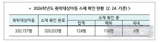 경찰청(경찰청장 직무대행 유재성)은 2026년 2월 24일 기준 소재가 확인되지 않은 124명의 아동에 대해 수사를 이어가고 있다. 이 중 118명은 해외 출국 사실이 확인되어 외교부 및 현지 공관과 협조해 현지 경찰에 수사를 요청하고 있으며, 국내 거주가 추정되는 6명에 대해서도 계속해서 수사를 진행할 계획이다.