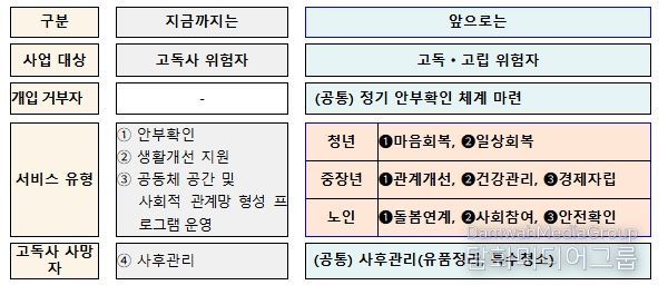 이를 위해 보건복지부는 생애주기별 맞춤형 서비스 개발 연구 결과를 반영하여 전문가 자문과 지자체 담당자의 의견수렴 등을 통해 현장 적용성을 확보하고 고독‧고립 예방 및 관리 사업 운영 지침을 개정했다.