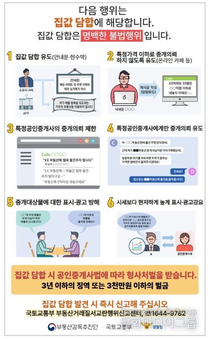특히, 이번 협의회에서는 온라인 커뮤니티 등을 통해서 시세에 부당한 영향을 줄 목적으로 집값 담합하는 행위에 대한 대응방안을 논의했으며, 국토부, 경찰청, 지자체 등 관계기관이 긴밀히 공조하여 불법행위에 무관용의 원칙으로 적극 대응해나가기로 했다.