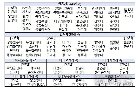 2026년에는 피지컬 인공지능(Physical AI) 시대, 중요성이 증대되고 있는 로봇 분야 2개교, 미래차 2개교를 선정했다. 또한 인공지능(AI) 분야 37개교는 지역별로 기업 수요에 기반한 인공지능(AI) 인재가 양성될 수 있도록, 비수도권 30개교(대경권 6개교, 동남권 6개교, 충청권 6개교, 호남권 6개교 및 강원·전북·제주 6개교), 수도권 7개교(서울 3개교, 경기·인천 4개교) 등 권역별로 선정했다.