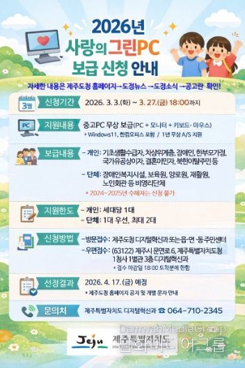 시민행정신문 강갑수 기자 | 제주특별자치도가 ‘2026년 사랑의 그린PC(중고PC) 보급사업’의 선정 방식을 개선하고 3월 3일부터 27일까지 신청을 받는다.