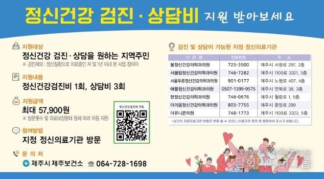 지원 대상은 최근 1년 이내 정신건강의학과 진료 이력이 없는 제주시민으로 지정 정신의료기관을 방문하면 1인당 연 3회, 최대 5만 7,900원 한도 내에서 ‘정신건강검진비 및 상담비’를 지원받을 수 있다.