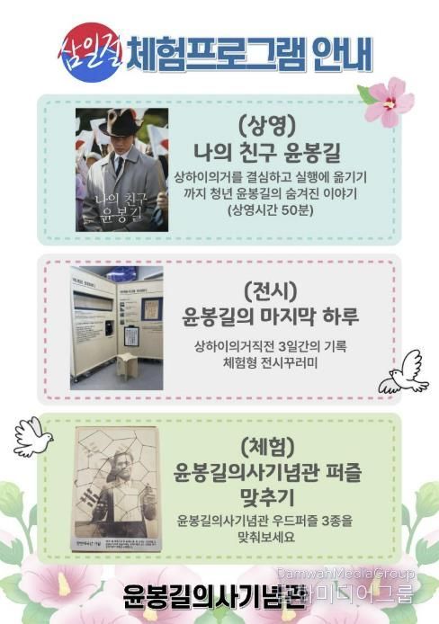 기념관 관계자는 “삼일절은 우리 민족의 독립 의지와 자유의 가치를 되새기는 뜻깊은 날로 관람객들이 체험을 통해 윤봉길 의사의 숭고한 정신을 자연스럽게 느끼는 시간이 되길 바란다”고 말했다.
