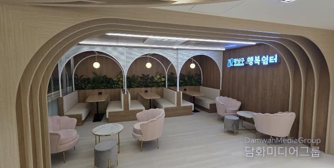 행복쉼터에는 계단형 휴게공간, 포켓형 공간, 창가 테이블, 바(Bar) 테이블 공간을 조성하고, 공간 특성에 맞는 테이블과 의자를 배치했다. 개인 방문객은 물론 가족 단위 이용객도 편리하게 이용할 수 있도록 동선을 정리했으며, 소형 싱크대도 설치했다. 직원과 미화원을 위한 별도 휴게공간도 함께 마련했다.