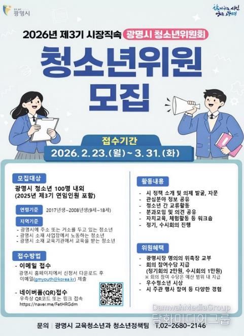 시는 오는 3월 31일까지 2026년 제3기 청소년위원회 위원 100명을 모집한다.