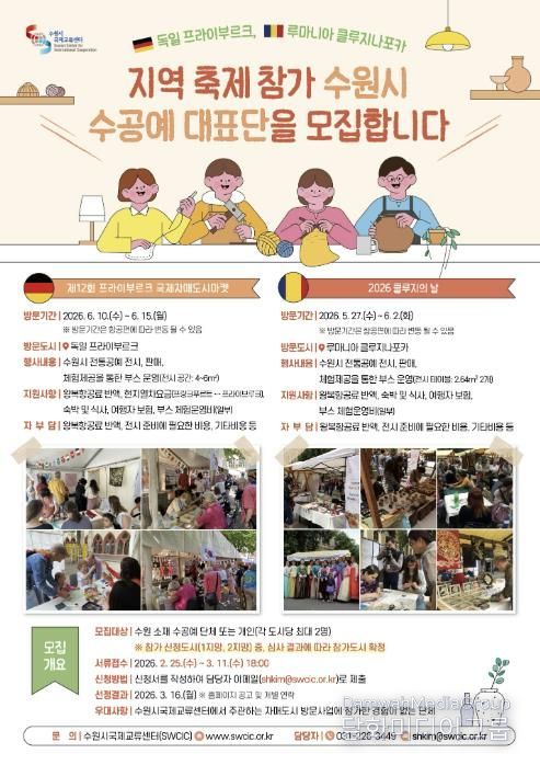 수원시국제교류센터 관계자는 “자매도시 축제 현장에서 수원의 전통 공예를 소개하고 ‘2026-2027 수원방문의 해’를 널리 알릴 뜻깊은 기회”라며 “국제교류와 시민외교에 관심 있는 수공예 단체와 개인이 적극적으로 참여해 주시길 바란다”고 말했다.