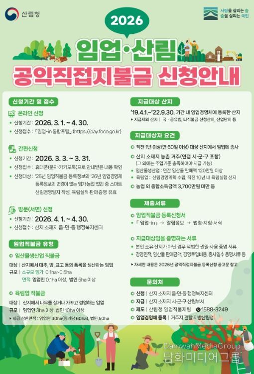시민행정신문 이세훈 기자 | 청양군이 임업인의 소득을 보전하고 산림의 공익적 가치를 높이기 위해 ‘2026년 임업·산림 공익직접지불금’ 신청 접수를 내달 4일부터 시작한다.