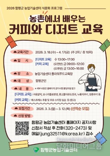 수강생 모집은 내달 3일부터 12일까지 24명을 선착순으로 접수하며, 함평 농특산물과 커피 디저트 체험에 관심 있는 군민이면 누구나 참여할 수 있다. 신청은 함평군 농업기술센터 영농지원과에 방문하거나 전화 또는 이메일을 통해 접수하면 된다.