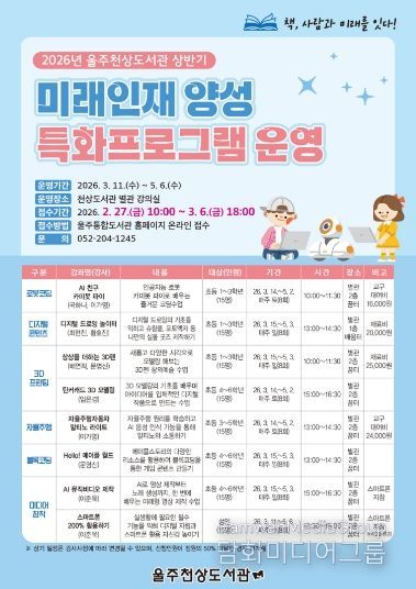 울주천상도서관 관계자는 “새로운 배움의 싹이 트는 상반기 프로그램을 통해 지역주민의 일상이 문화로 더욱 빛나길 바라며, 앞으로도 도서관이 미래 역량을 키우는 선도적인 공간이 되도록 노력하겠다”고 밝혔다.