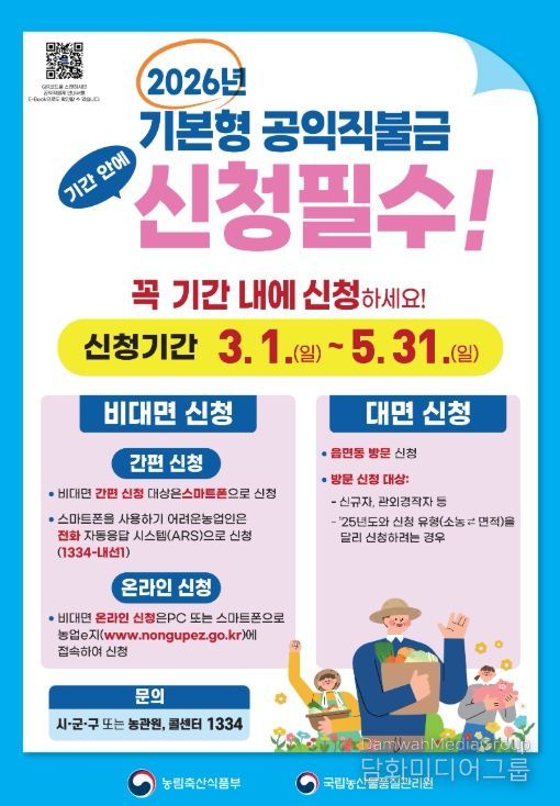 시민행정신문 강갑수 기자 | 공주시는 오는 3월 1일부터 ‘2026년 기본형 공익직불금’ 신청을 받는다고 27일 밝혔다.
